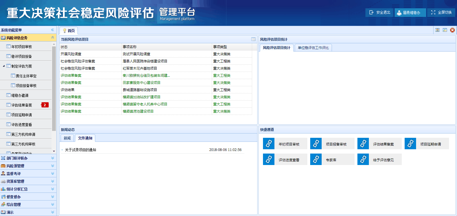 寶雞市領導在考察了南通市維穩辦的社會穩定風險評估系統后,決定在寶雞市建設該平臺,并決定將眉縣作為試點,平臺實現眉縣上下、各部門之間評估數據實時反應、社會資源共享共用、部門聯動協同評估,為各級部門領導科學決策提供依據。眉縣社會穩定風險評估系統成功落地實施后,在寶雞市全面推廣。
